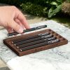 Oval desktop pen and pencil holder with a textured leaf design and ceramic pigment accents on the exterior, and a glazed interior. Approximately 3″ × 4″ and 4″ high. Suitable for holding brushes, pencils, or other small desk items. Each piece is one of a kind.